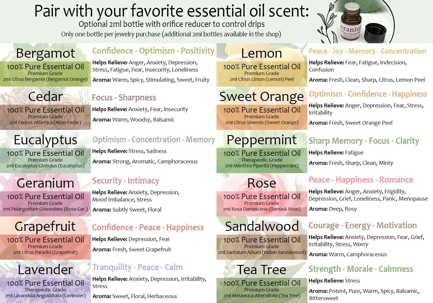 Choose a 2ml glass bottle of 100% pure essential oil (with orifice reducer) for aromatherapy bliss. Please note: Only add 1-2 drops of oil at a time. Soaking in oil may harm jewelry over time.