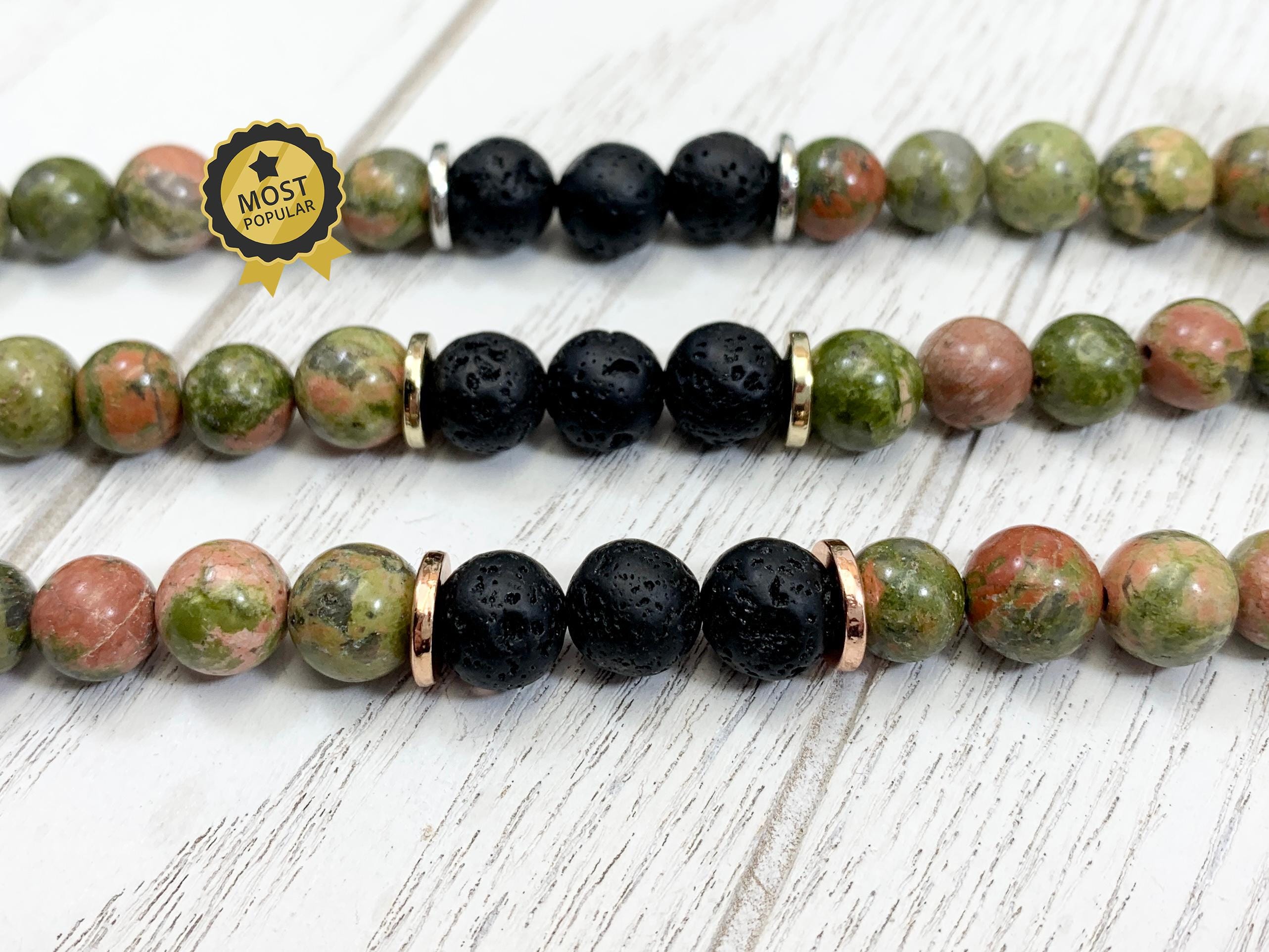 Beads & Diffuser Function: Polished 8 mm Unakite Jasper beads are strung on strong elastic fiber, interspersed with lava rock diffuser beads and your choice of spacer style.