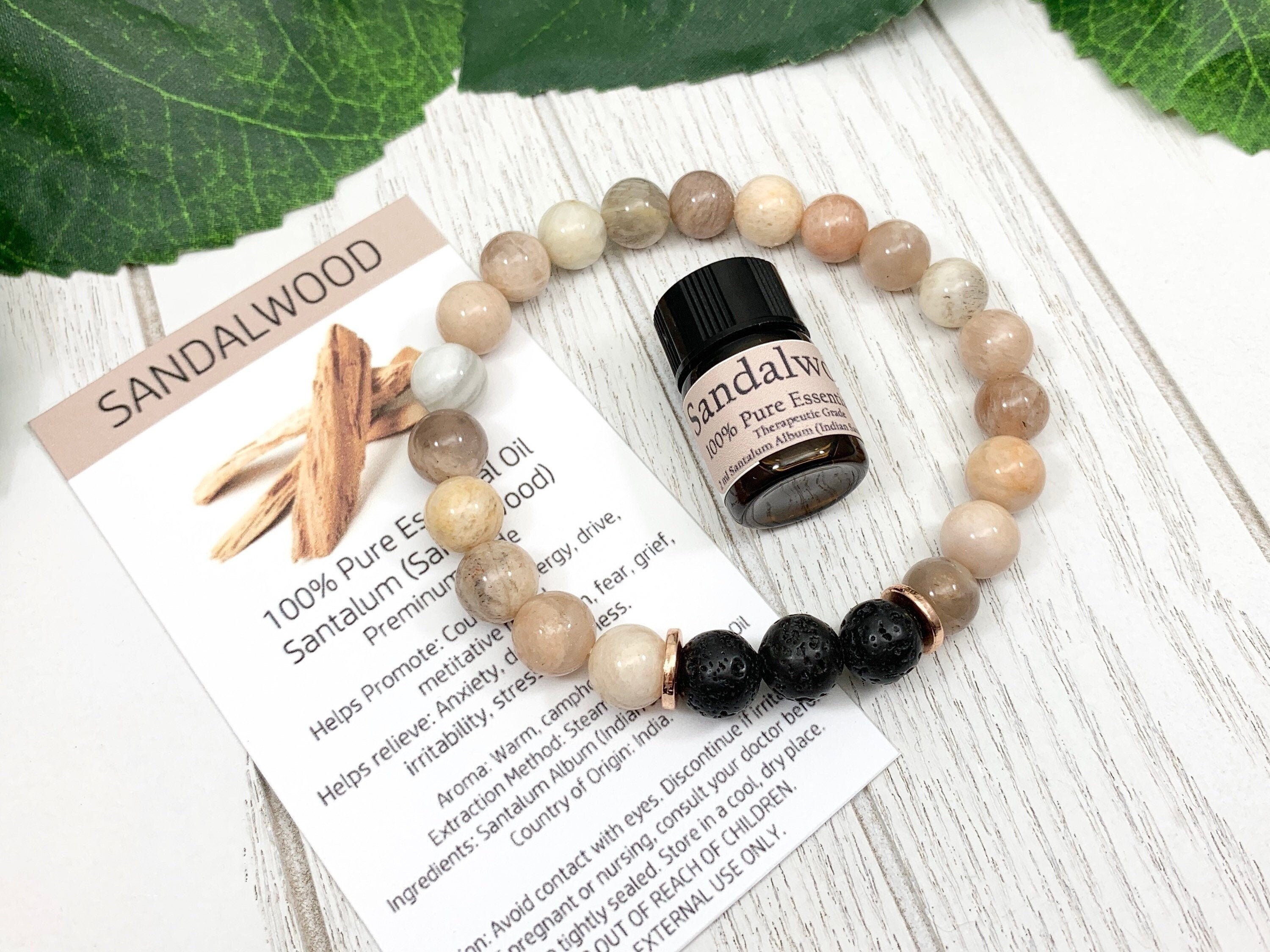 The perfect essential oil diffuser bracelet gift for self-healing and care for him or her. Get motivated with polished round 8mm tan and beige Sunstone beads on an elastic fiber cord, featuring three black 8mm Lava Rock diffuser beads in between two spacer beads of your choice.