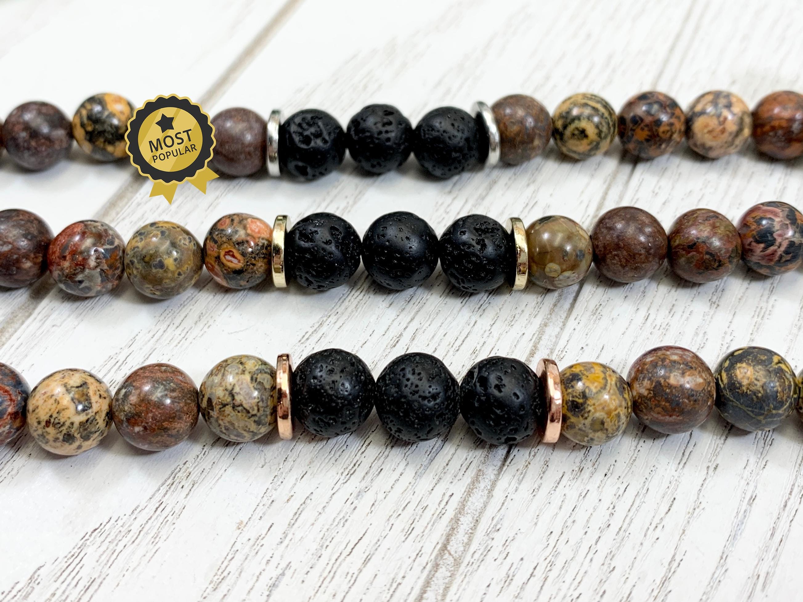 Beads: Alternating 8 mm polished leopardskin jasper (warm tan with black spots) + matte black lava stones strung on durable elastic fiber.