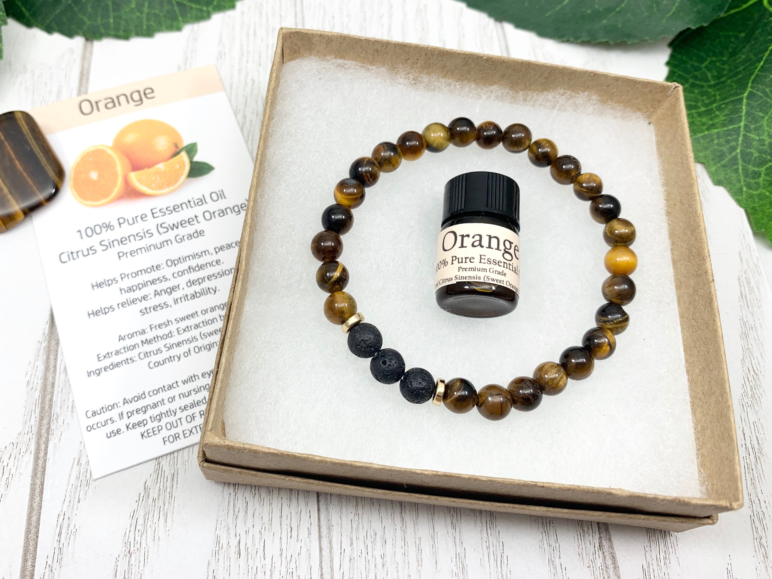 This Tiger's Eye Diffuser Bracelet combines polished 6mm golden tiger's eye beads with black lava stones on an elastic fiber cord, featuring gold, rose gold, or silver spacer beads. It's a wearable blend for power, protection, and aromatherapy.