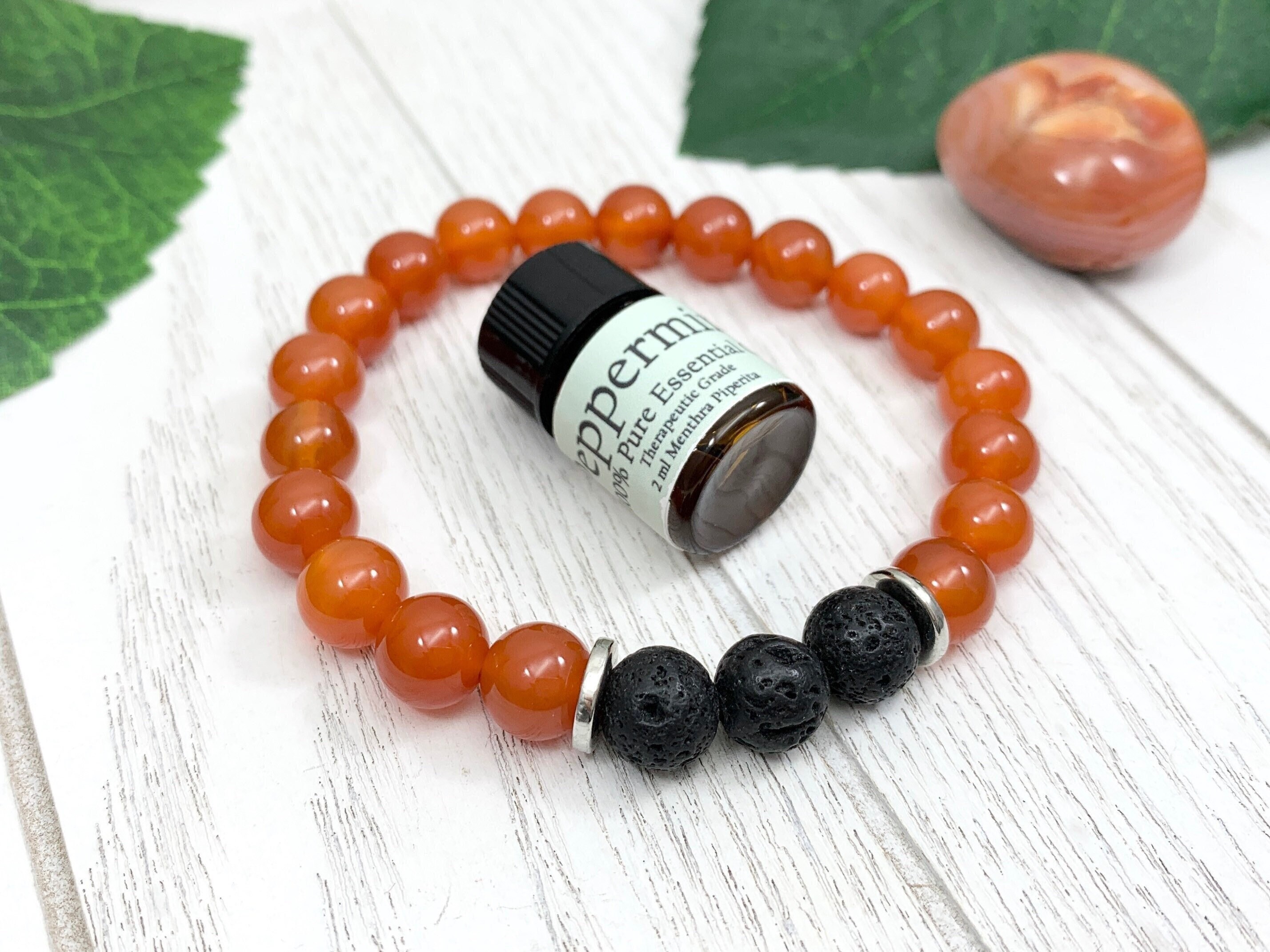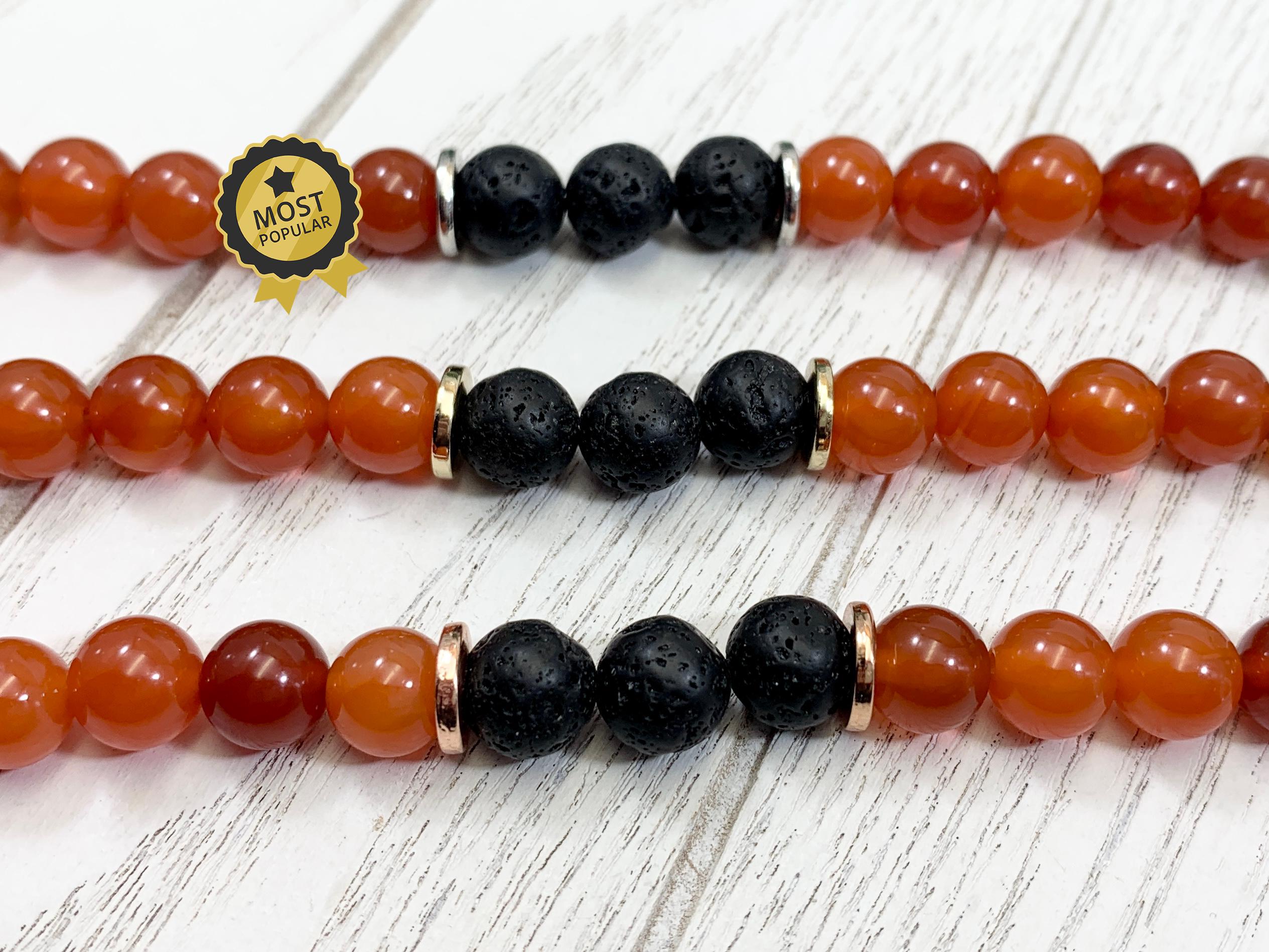 This Carnelian Diffuser Bracelet combines polished 8 mm carnelian beads with black lava stones. A wearable blend for grounding, motivation, and subtle aromatherapy.