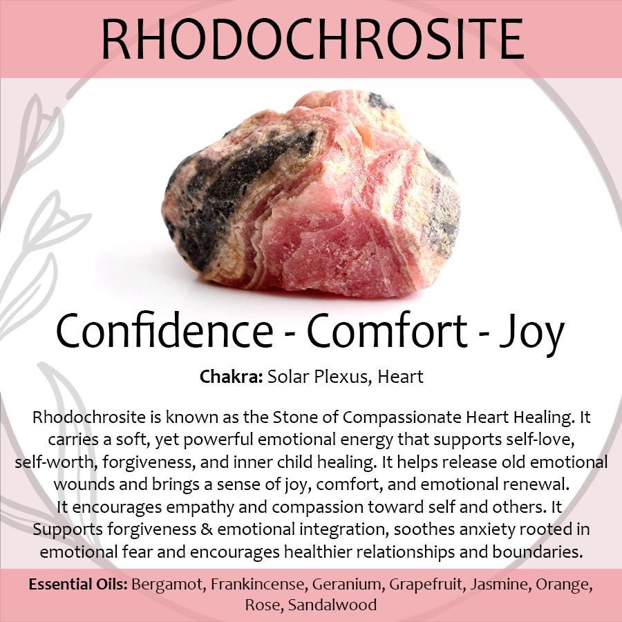 Heart Healing: Rhodochrosite opens the heart chakra, fosters emotional release, and invites joy. Ideal for self-love or relationships.