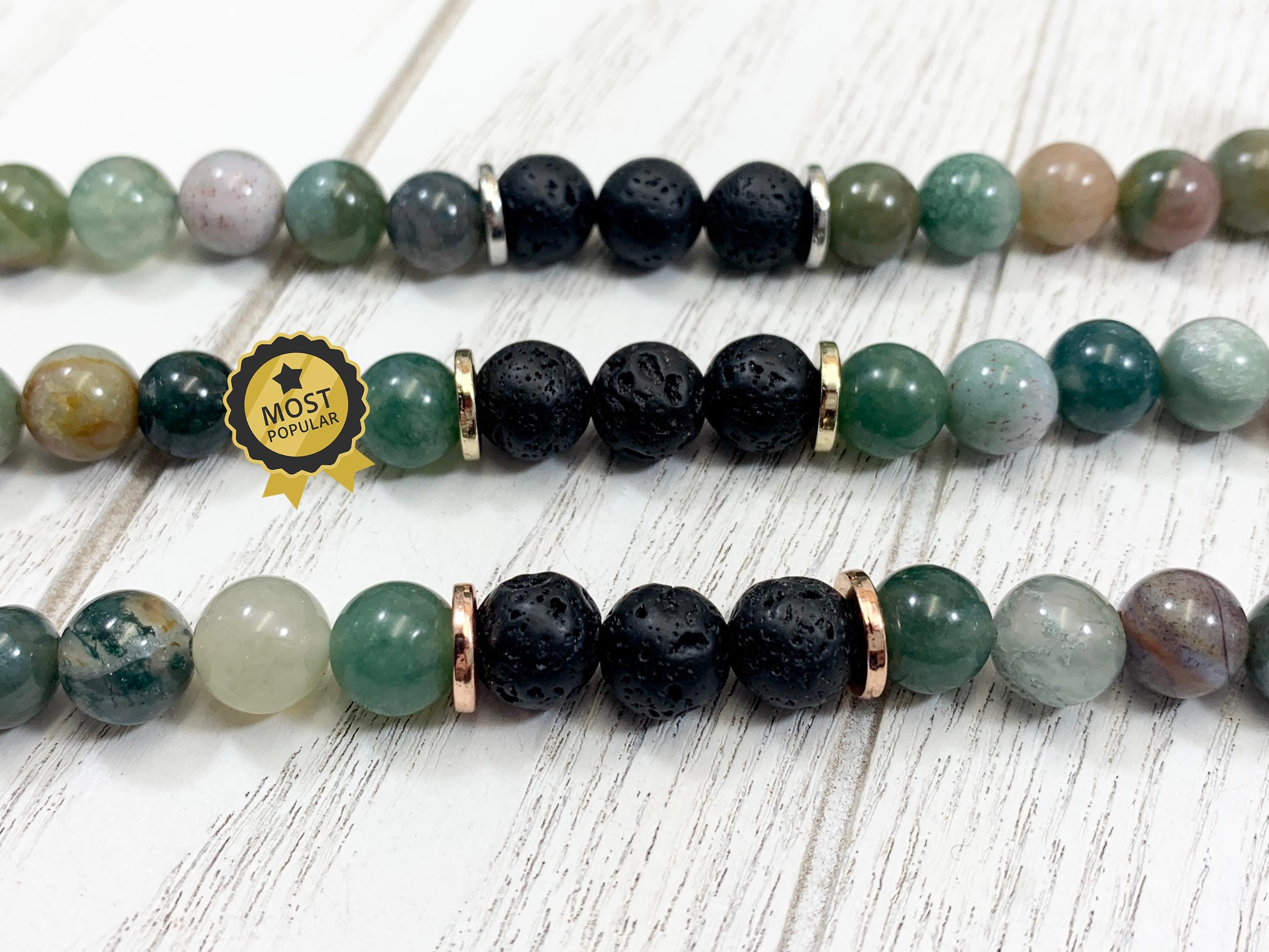 Polished bead combination (8 mm Indian agate) with strategically placed lava stone diffuser beads, and choice of metal spacer accents.