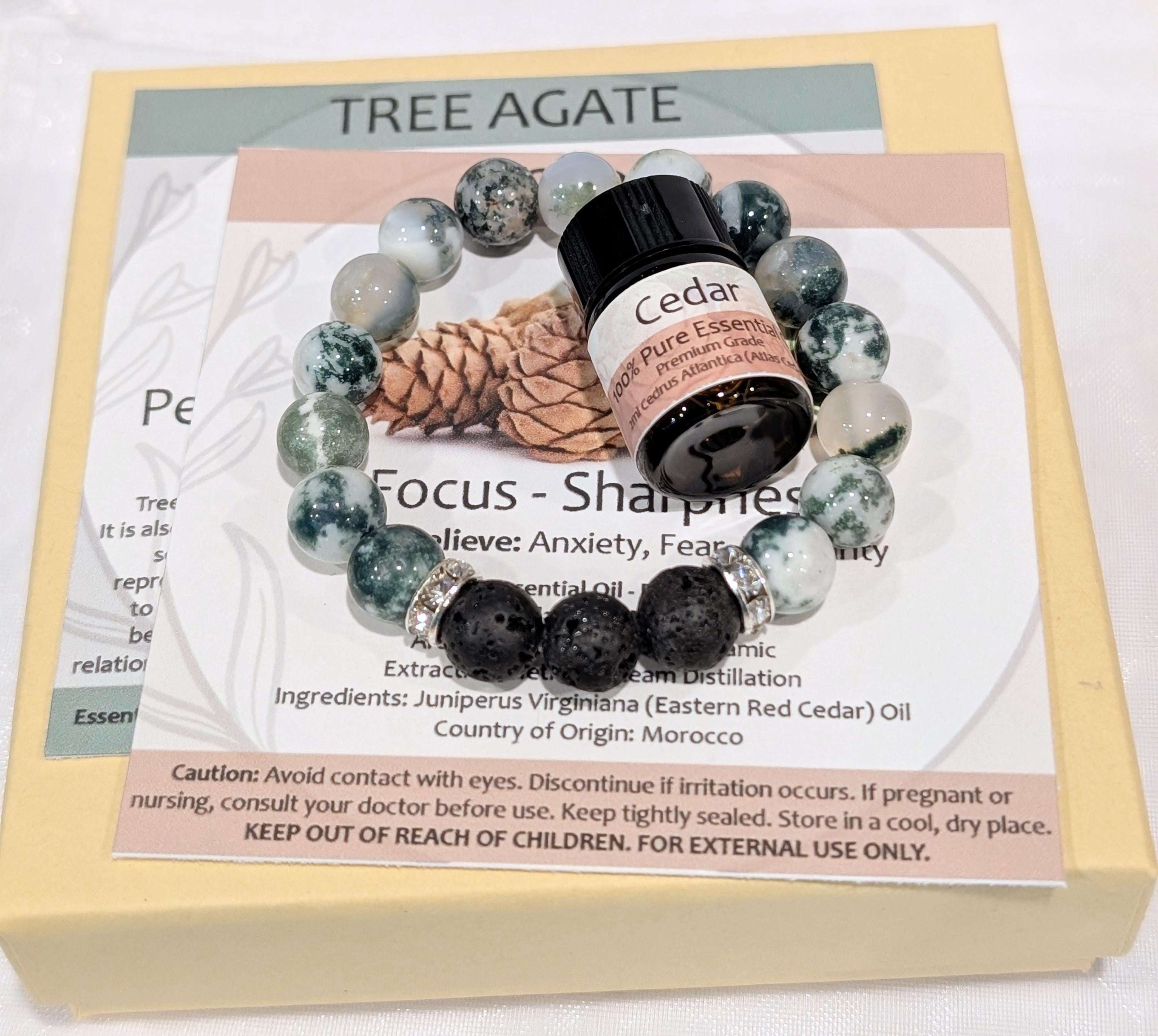 Polished 8 mm tree-agate beads combined with black lava rock diffuser beads on a strong elastic fiber cord.