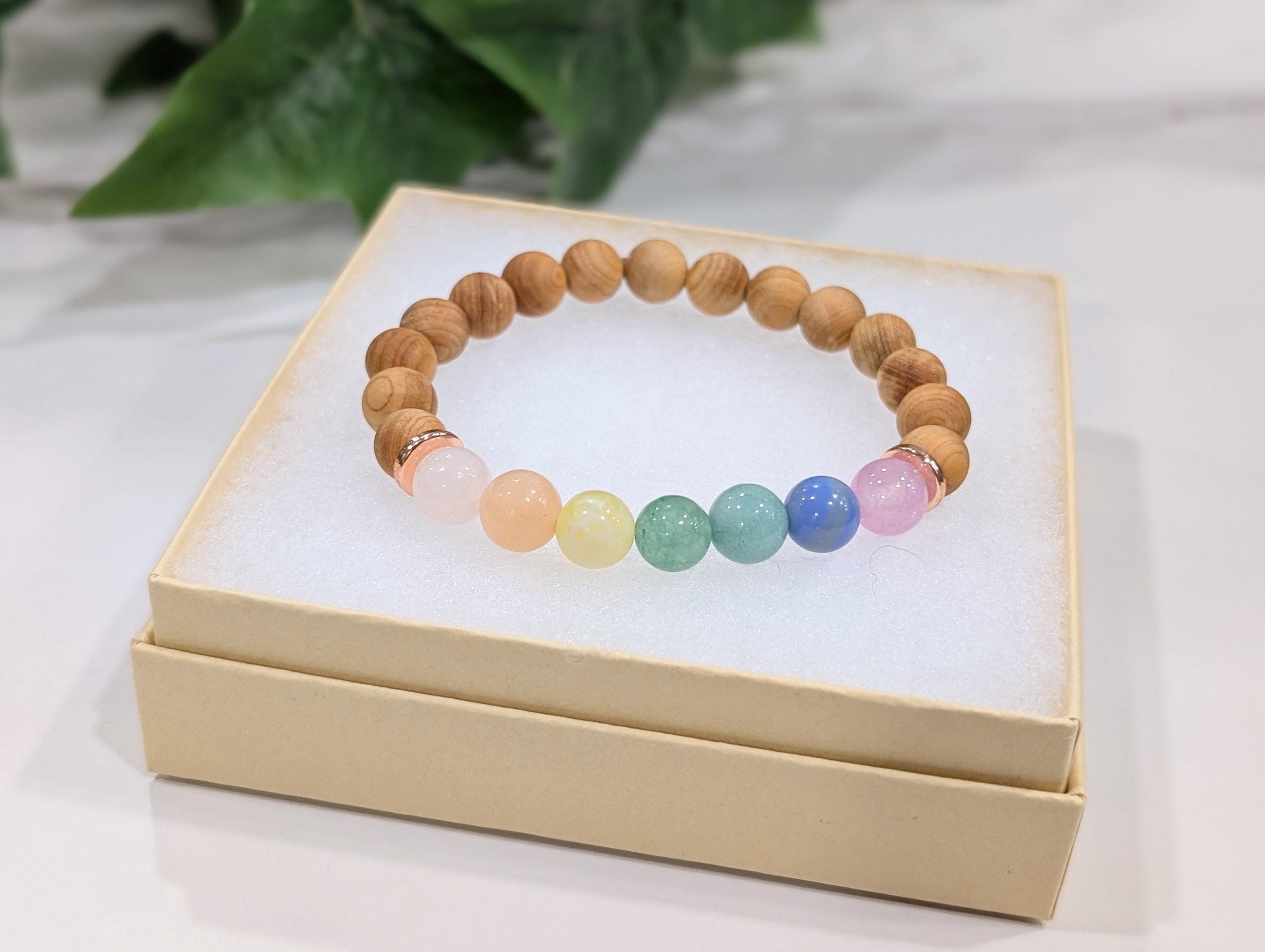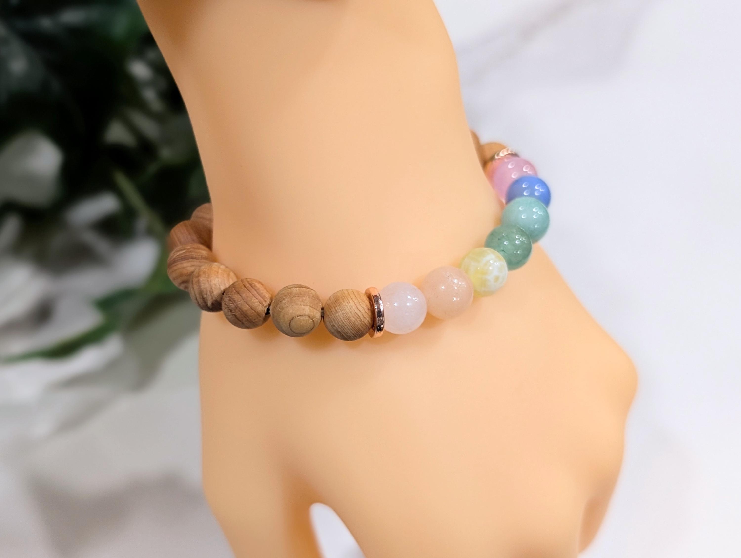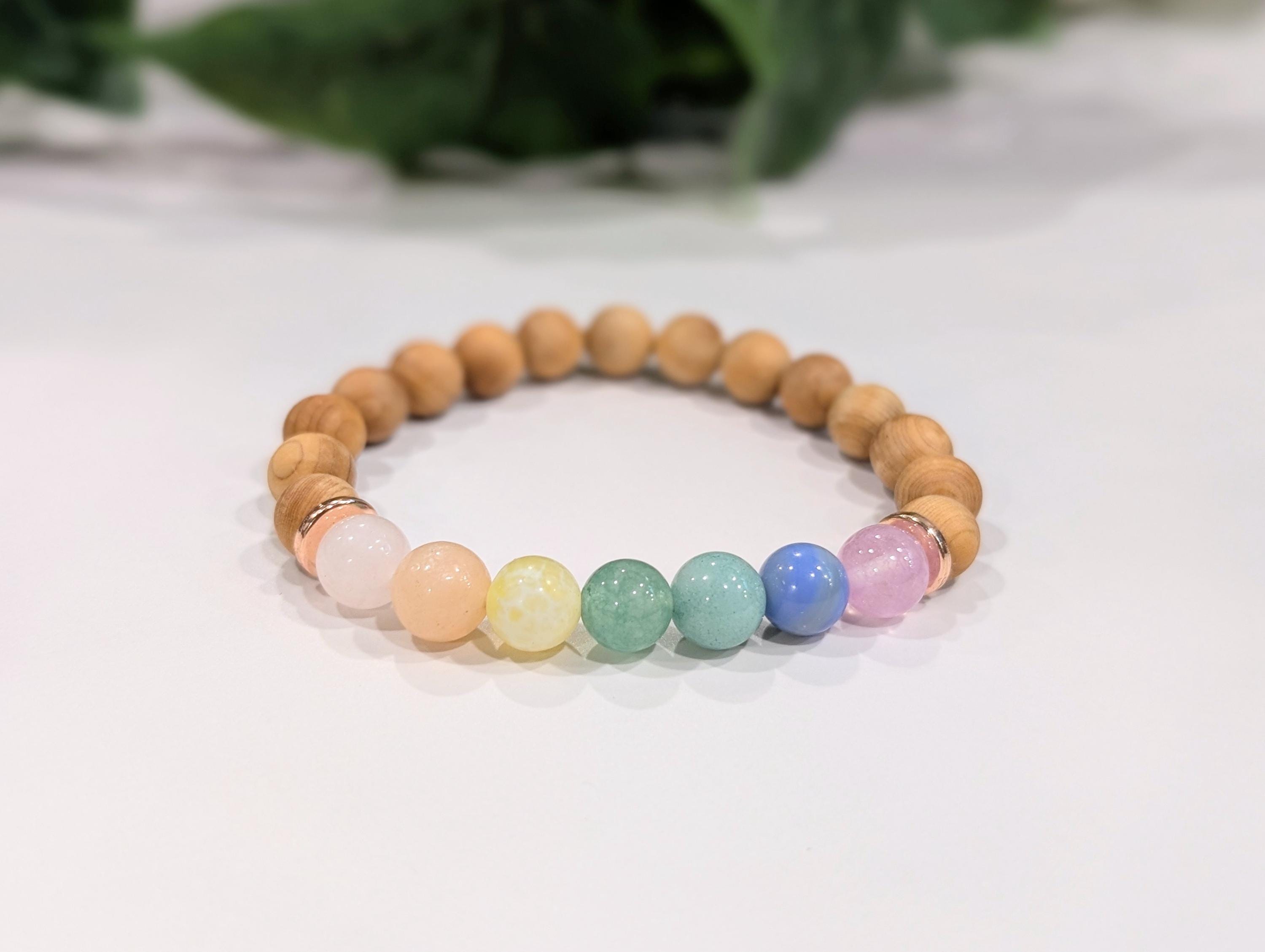 Beads: 8mm smooth sandalwood + polished 7 chakra gemstones in soft pastel colors