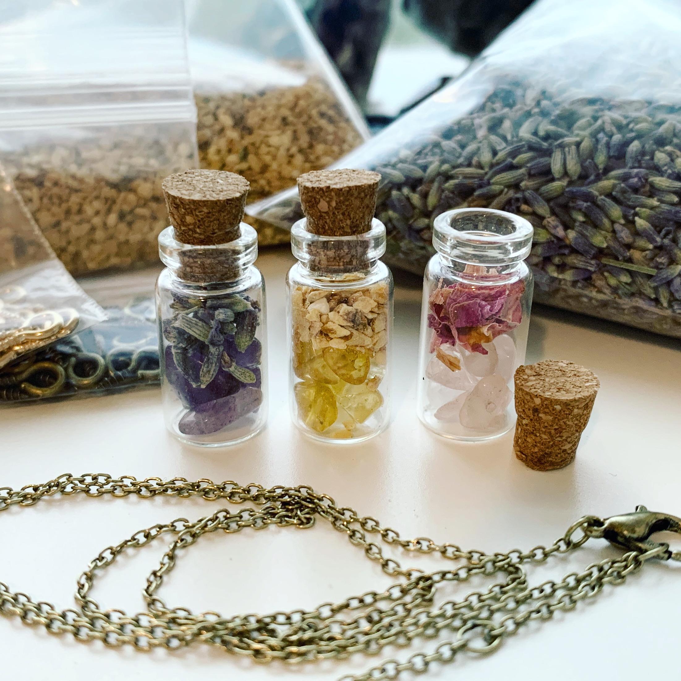 This Crystal Herb Bottle Necklace lets you choose between Rose Quartz, Citrine, or Amethyst crystal chips, paired with dried petals or herbs inside a tiny glass vial, accented with a lava bead diffuser: a wearable way to carry love, joy, or calm wherever you go.